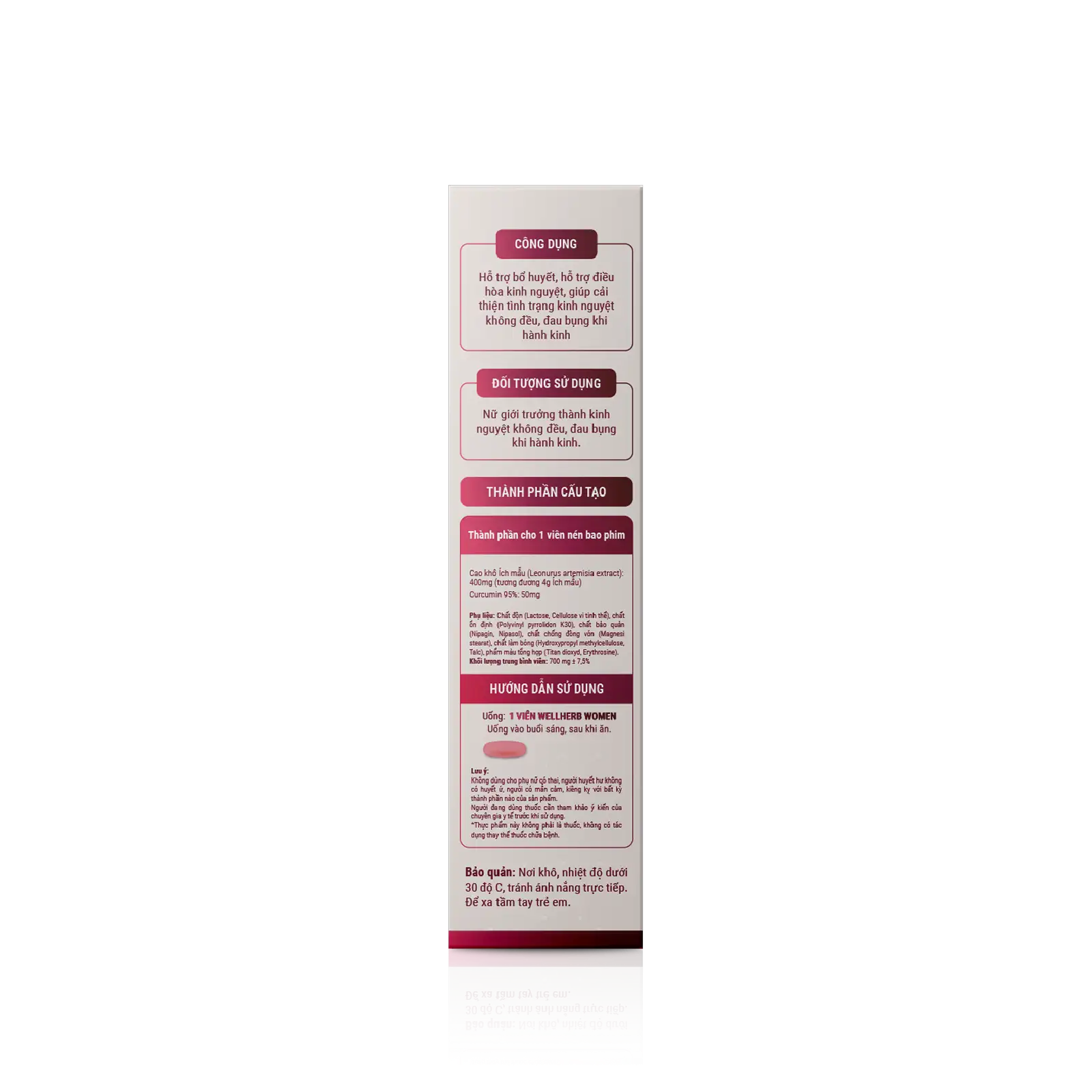 Viên uống điều kinh WellHerb Women có thành phần chính bào chế từ cao khô ích mẫu và curcumin, hỗ trợ điều hòa kinh nguyệt, ổn định nội tiết tố, tăng cường lưu thông máu cũng như nâng cao sức khỏe cho phụ nữ.