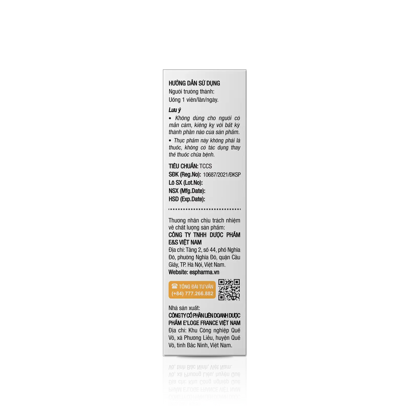 Khi mua sản phẩm phải có tem chống hàng giả của E&S Việt Nam. Nếu cần kiểm tra qua mã vạch, khách hàng hãy sử dụng ứng dụng Scan and Check là phần mềm quét mã vạch chính thống, miễn phí trên điện thoại di động (hệ điều hành Android và IOS) của Tổng cục Tiêu chuẩn Đo lường Chất lượng (STAMEQ) – cơ quan quản lý Nhà nước về mã số mã vạch (MSMV) – để quét kiểm tra tính hợp pháp của MSMV và thông tin chính hãng về xuất xứ, về các thuộc tính của hàng hoá gắn MSMV.